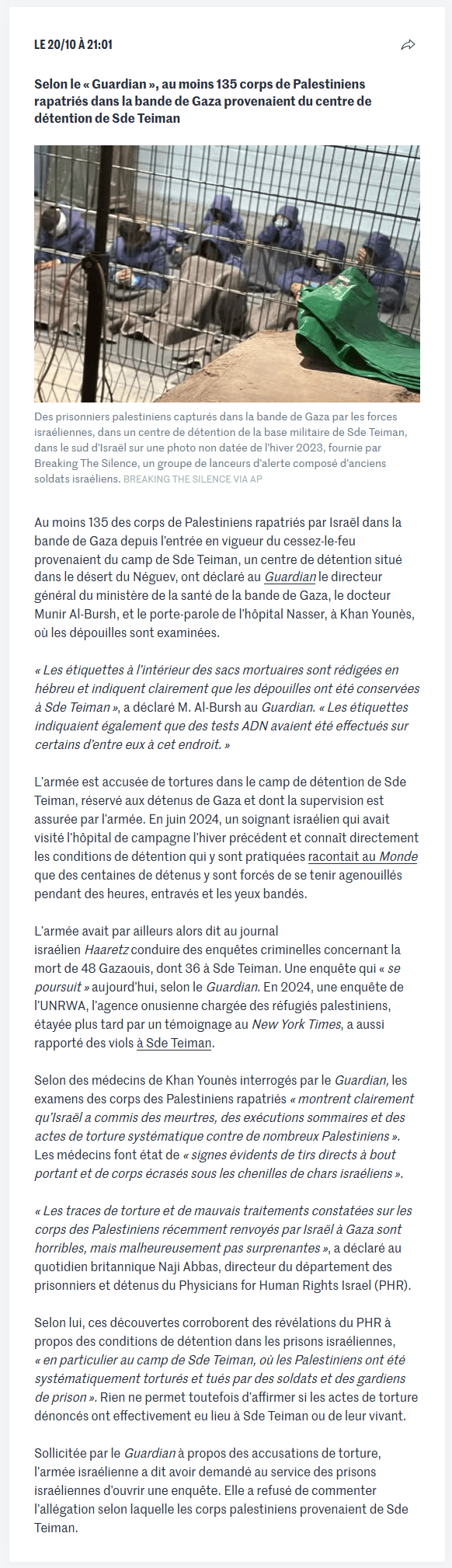 En comparant l'article du Guardian intégralement traduit ci-dessous, où le fait que 135 cadavres de Palestiniens aient été restitués dans un état effroyable par l'occupation israélienne est indiqué dès le titre, et le compte rendu (intégré ci-après) qu'en fait Le Monde, supprimant le mot-clé (« mutilés ») du titre, on comprend que les médias dominants n'ont d'autre vocation que de servir de service après-vente pour les atrocités israéliennes, pour reprendre le mot d'Alain Marshal (qui analyse ici le traitement de ce sujet par Mediapart). Notons que le Guardian avait déjà publié un article sur les actes de tortures et exécutions constatés sur les cadavres palestiniens le 15 octobre. Au moins 135 corps mutilés de Palestiniens détenus dans une prison israélienne tristement célèbre, selon des responsables de GazaDes documents indiquent qu’ils provenaient de Sde Teiman, déjà accusée de torture et d'assassinats extra-judiciaires. Source : The Guardian, 20 octobre 2025 Traduction : lecridespeuples.substack.com Au moins 135 corps mutilés de Palestiniens renvoyés par Israël à Gaza avaient été détenus dans un centre de détention tristement célèbre, déjà visé par des accusations de torture et de décès illégaux en détention, ont indiqué des responsables du ministère de la Santé de Gaza au Guardian. Le directeur général du ministère de la Santé, le Dr Munir al-Bursh, et un porte-parole de l’hôpital Nasser de Khan Younis, où les corps sont examinés, ont déclaré qu’un document trouvé à l’intérieur de chaque sac mortuaire indiquait que tous provenaient de Sde Teiman, une base militaire située dans le désert du Néguev où, selon des photos et témoignages publiés par le Guardian l’année dernière, des détenus palestiniens étaient enfermés dans des cages, les yeux bandés et menottés, enchaînés à des lits d’hôpital et contraints de porter des couches.